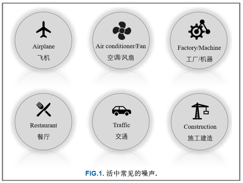 在我们日常的生活当中,充斥着各种噪声。Fig.1列举了六种生活中比较常见的噪声。在这些噪声中,飞机噪声、空调/风扇噪声,机器噪声相对比较平稳,没有明显的波动,此类噪声我们称之为Stationary Noise [1] (Goodman, N. R., 1961)。而餐厅噪声、交通噪声和施工噪声通常是Non-Stationary Noise [2] (Rangachari, 2006)。在Non-Stationary Noise中,比较具有代表性的要数餐厅里的噪音Babble Noise,著名的Cocktail Party Effect [3] (Arons, 1992) 就是基于Babble Noise的。Babble Noise是指多个说话者的交谈声组成的背景噪声,此类噪声不仅仅是非平稳的,而且和我们所需语音的成分相似,导致在进行语音增强Speech Enhancement(语音为所需信号时的噪声抑制)时难度增大。