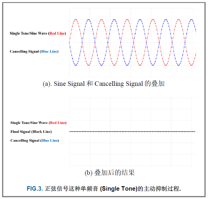 Fig.3展示了上述对于正弦信号这种单频音 (Single Tone)的主动抑制过程。如Fig.3(a)所示,红色信号代表噪声信号sn(t),蓝色信号代表Cancelling Signal sc(t)。由Fig.3(b)所示,叠加后,噪声信号sn(t)已被抵消。