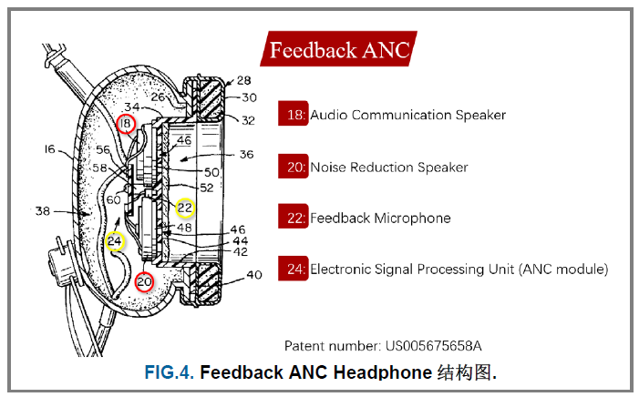 根据ANC的基本工作原理,我们来介绍一下ANC耳机的结构。我们以Feedback ANC Headphone [6] (Brittain, 1997) 为例。Fig.4展示了一个Feedback ANC Headphone的一个剖面图,其中模块18是Audio Communication Speaker,它的功能是播放所需要的声音,比如语音或者音乐。模块20是Noise Reduction Speaker,它的职责是播放Cancelling Signal。模块22和模块24则是负责计算和生成这个Cancelling Signal的关键模块。模块22是Feedback Microphone,它位于耳机内部,负责监听耳机内部的环境噪音。外部的环境噪音,通过耳机罩,到达耳机内部的时候,这时的信号为耳机内部的环境噪音。拿到了这个信号后,模块22会将其传入模块24,模块24则负责ANC算法的计算,通过自适应滤波 (Adaptive Filtering) 实时地生成Cancelling Signal,并发送给Noise Reduction Speaker将其播出,去抵消噪声。