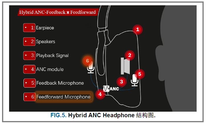 除了Feedback ANC,还有一种ANC的类型是Feedforward。而目前比较流行的ANC算法是Feedback结合Feedforward的Hybrid算法。Fig.5展示了Hybrid ANC的示意图。通过示意图我们可以看到,Hybrid ANC大多数模块都和Feedback ANC一样,唯一的不同是多了一个Feedforward Microphone (在Fig.5中的模块6)。这个Microphone安置在耳机的外部,用来收集耳机周围环境噪音,在进入耳机之前的声音信息。
