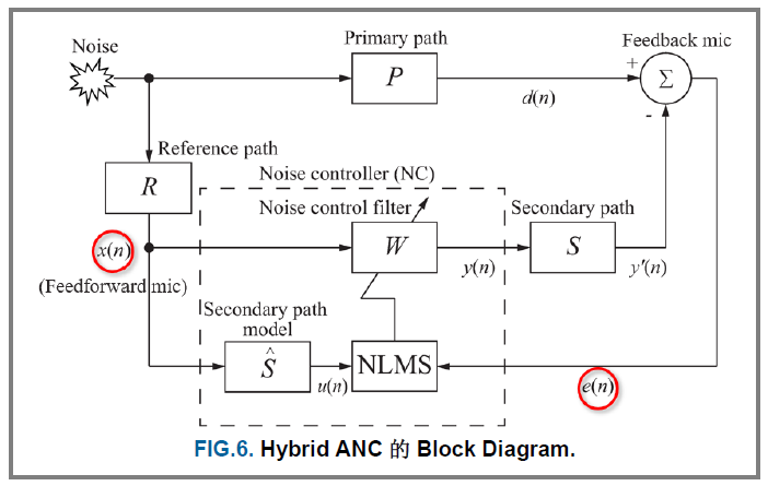 Fig.6里展示了Hybrid ANC的Block Diagram。Feedback Microphone采集到的信号为e(n),它同时也是最后耳朵所听到的信号。x(n)代表Feedforward Microphone采集到的信号。外界的噪声在被Feedforward Microphone采到的同时,也会透过耳机 (Primary Path),传入耳道 (Ear Canal)。在耳道处,会与耳机的Speaker播放出来的Cancelling Signal y'(n)相互叠加,最终达到消除d(n)的效果,