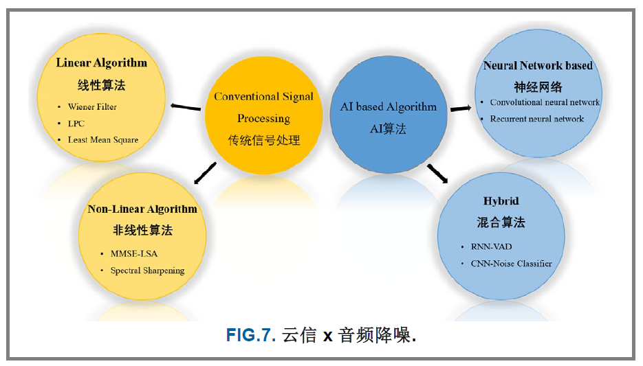 云信的音频团队在音频算法上有着深厚的积累。在音频降噪这一模块,主要的方向依然是传统信号处理和AI算法双管齐下 (Fig.7)。传统信号处理算法中,对于Stationary Noise采用线性的算法进行处理,对于Non-Stationary Noise比如Transient Noise,会用到非线性的传统算法。在AI领域,云信音频会更注重混合型的AI算法,将AI作为降噪算法中的一个子模块,结合传统信号处理算法,在保证语音质量的情况下提升降噪效果。