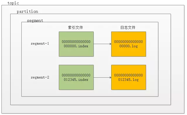在kafka服务器,分区是以目录形式存在的,每个分区目录中,kafka会按配置大小或配置周期将分区拆分成多个段文件(LogSegment), 每个段由三部分组成: