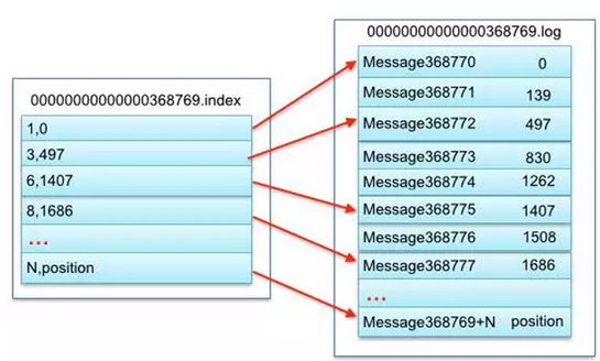但是这里也会有一个问题:如果每个消息都要在index文件中保存位置信息,那么index文件也很容易变得很大,这样又会减弱上文所说的好处。所以在kafka中,index设计为稀疏索引来降低index的文件大小,这样,index文件存储的实际内容为:该段消息在消息队列中的相对offset和在log文件中的物理偏移量映射的稀疏记录。