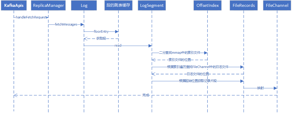 - 查找具体的Log Segment,kafka将段信息缓存在跳跃表中,所以这个步骤将从跳跃表中获取段信息。