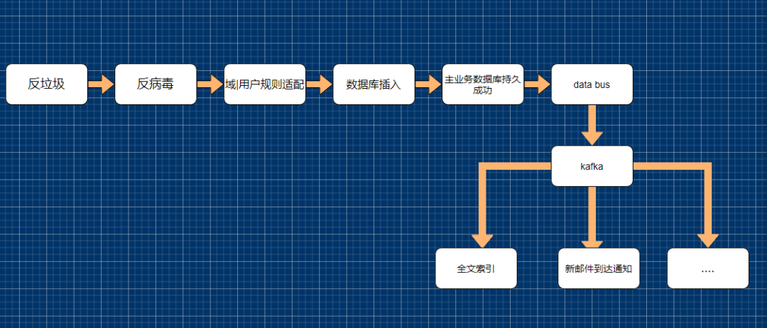 邮件系统用户收发信流程伴随着大量的业务逻辑和子系统调用,如果将这些流程都强依附在主干枝上,将会对系统造成较大的压力,整个业务流程也将变得复杂而缓慢。所以通过数据总线将主次流程进行解耦,减轻收发信主流程的复杂度,使其可以以更快的速度完成,加快系统响应时间。主流程产生事件源,通过kafka的传输,触发多个次要流程,次要流程可以并发在系统后台完成,并且可以轻易的扩展多种多样的次要流程。