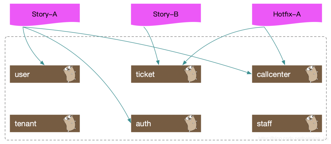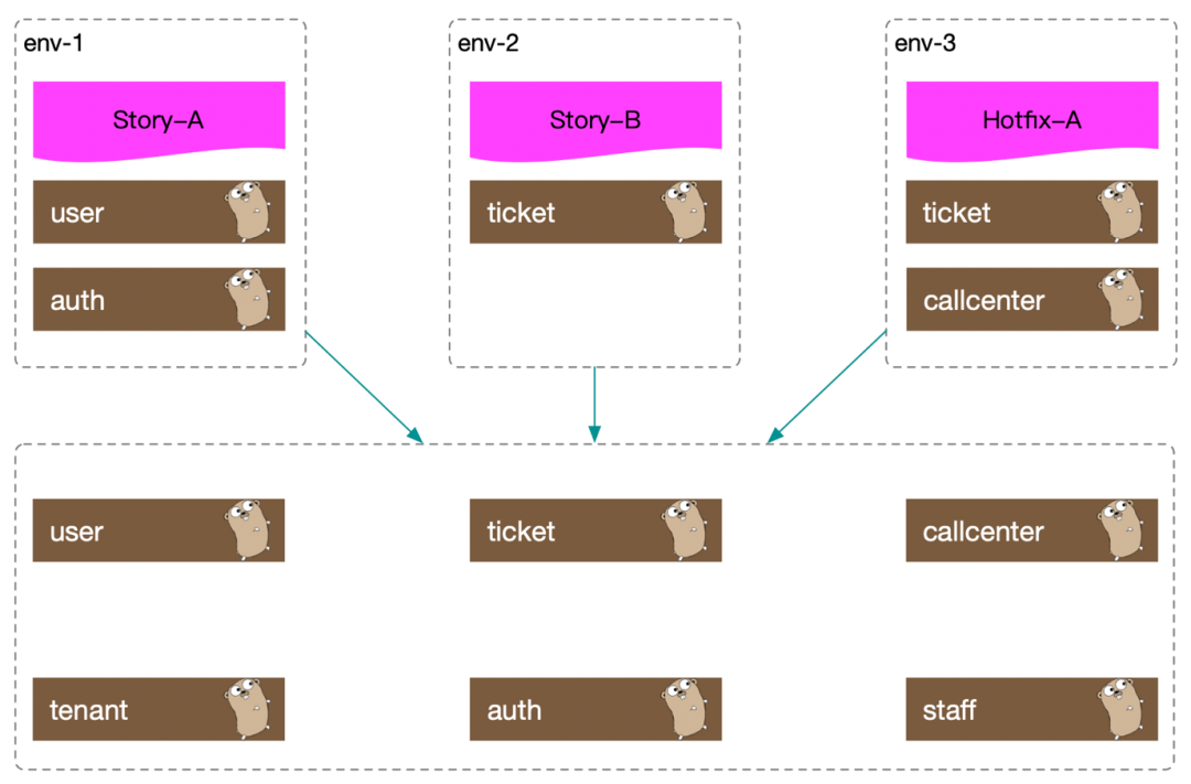 如上图,Story-A需要部署user和auth服务,那么我们创建env-1并部署我们的user和auth; Story-B需要部署ticket服务,那么我们就创建env-2并部署ticket服务;env-3同理。