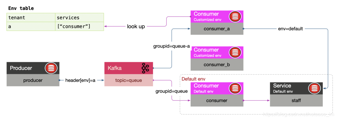 RPC在调用之前有如上所述的实例筛选过程,但消息中间件没有这个逻辑,不过我们依然可以干预消费规则,即在消费者拿到消息后判断是丢弃消息还是消费该消息。以kafka为例,测试环境的kafka consumer启动时,修改consumer groupid为groupid_${env}。kafka consumer接收到消息时,执行和上述RPC框架筛选实例时类似的逻辑即可。
