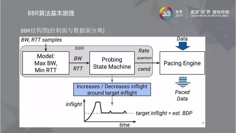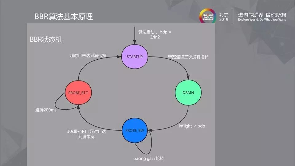 BBR算法的核心是找到最大带宽(Max BW)和最小延时(Min RTT)这两个参数,最大带宽和最小延时的乘积可以得到BDP(Bandwidth Delay Product), 而BDP就是网络链路中可以存放数据的最大容量。BDP驱动Probing State Machine得到Rate quantum和cwnd,分别设置到发送引擎中就可以解决发送速度和数据量的问题。