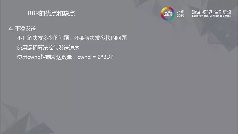 之前提到在TCP算法中并没有平稳发送的说法,BBR算法后来引入了平稳发送的概念,不只解决了发送多少的问题,还解决了发送速率的问题,具体实现是使用cwnd控制发送数量,发送速度使用漏桶算法控制。BBR算法中的cwnd与TCP算法不同,TCP算法中的cwnd是对网络状态的模拟,分为发送窗口和接收窗口,而BBR算法只有发送窗口,且cwnd = 2*BDP。