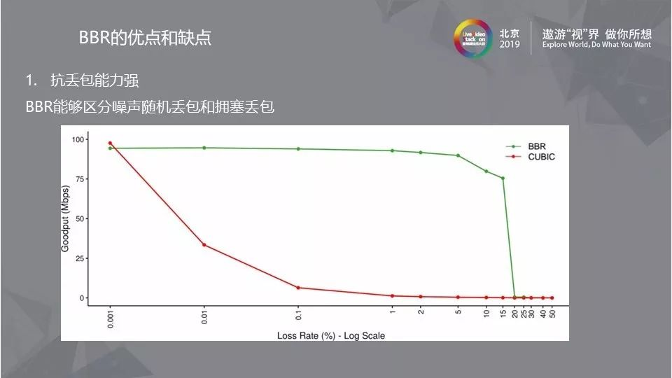 关于BBR算法的抗丢包能力可以用上图来说明,BBR算法不会因为一次或者偶然的丢包就大幅降低吞吐量,因此具有较强的抗丢包能力。