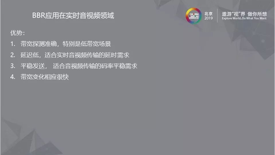 如果将BBR算法应用在实时音视频领域,需要满足带宽(特别是低带宽场景)探测准确,适合实时音视频传输的低延时需求,能够满足音视频传输码率平稳的需求以及快速响应带宽变化这四个要求。