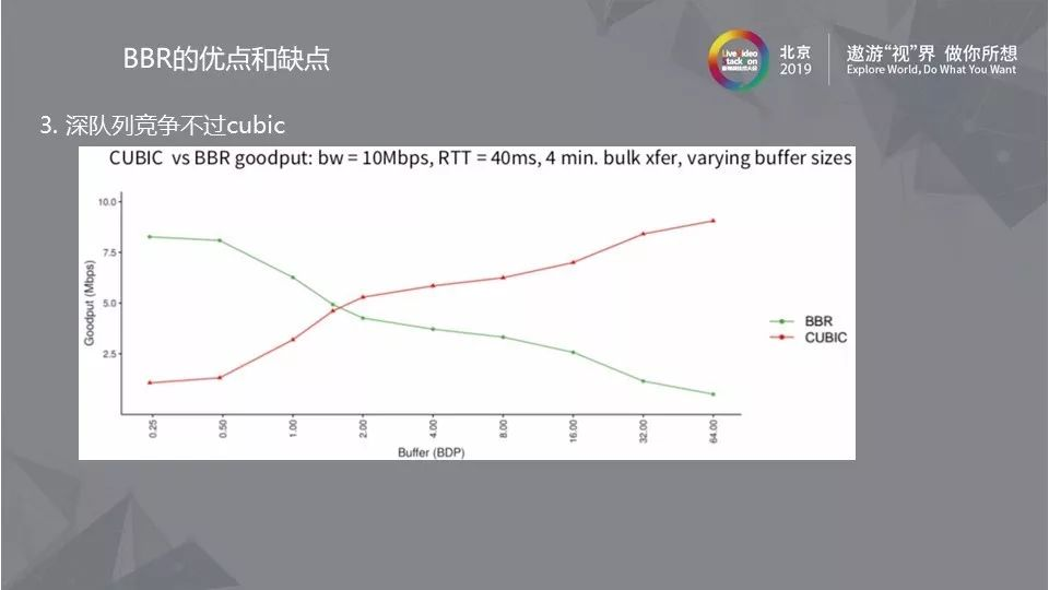 BBR算法设计之初cwnd = 2*BDP,在此之前BBR算法要比Cubic强很多,但在实际的网络环境中,如果出现buffer很大的情况,BBR是比Cubic竞争性差的,因此在应用BBR算法时必须了解当前的网络状况。