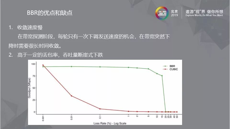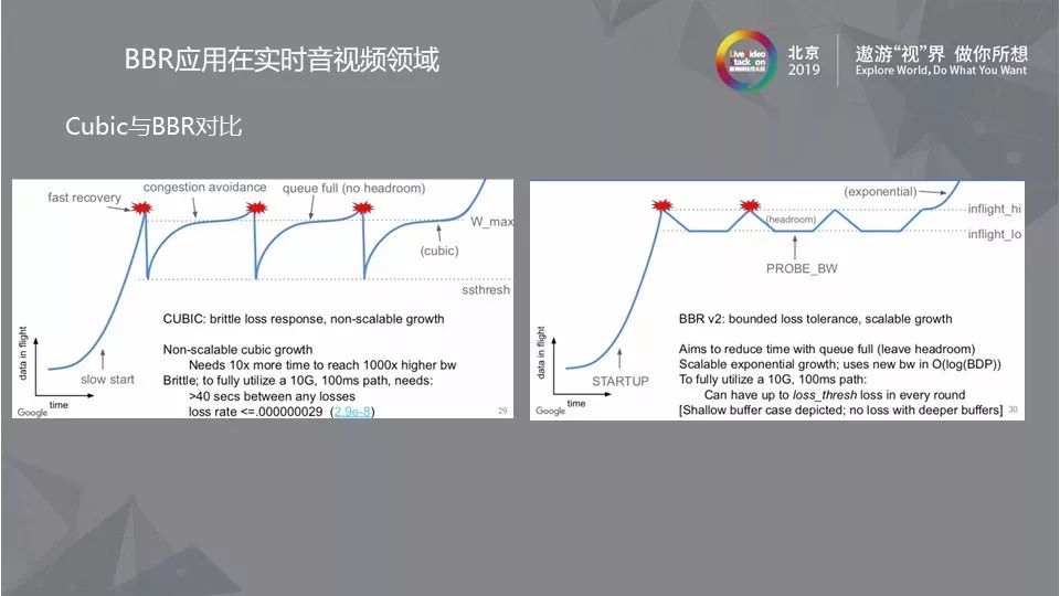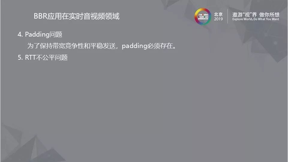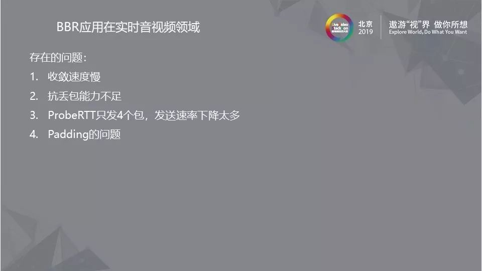 满足以上四个实时音视频需求的同时,BBR算法在应用时也存在着收敛速度慢、抗丢包能力无法达到预期的问题,另外实时音视频领域需要提供稳定的视频流,但BBR的ProbeRTT阶段只发4个包,发送速率下降太多会引发延迟加大和卡顿问题,最后BBR探测带宽需要Paddin有可能造成带宽浪费。