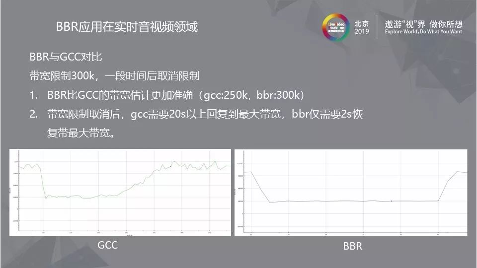 目前GCC控制算法在实时音视频领域占据主流,但WebRTC的GCC算法仍然有一些局限性,比如将带宽限制在300k,一段时间后取消限制的场景来对比,由图像对比可以得到,BBR比GCC的带宽估计更加准确(GCC:250k,BBR:300k),而在带宽限制取消后,GCC需要20s以上才能恢复到最大带宽,BBR仅需要2s就可以恢复。