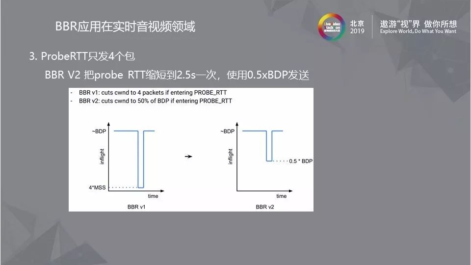 ProbeRTT并不适用实时音视频领域,因此可以选择直接去除,或者像BBR V2把probe RTT缩短到2.5s一次,使用0.5xBDP发送。