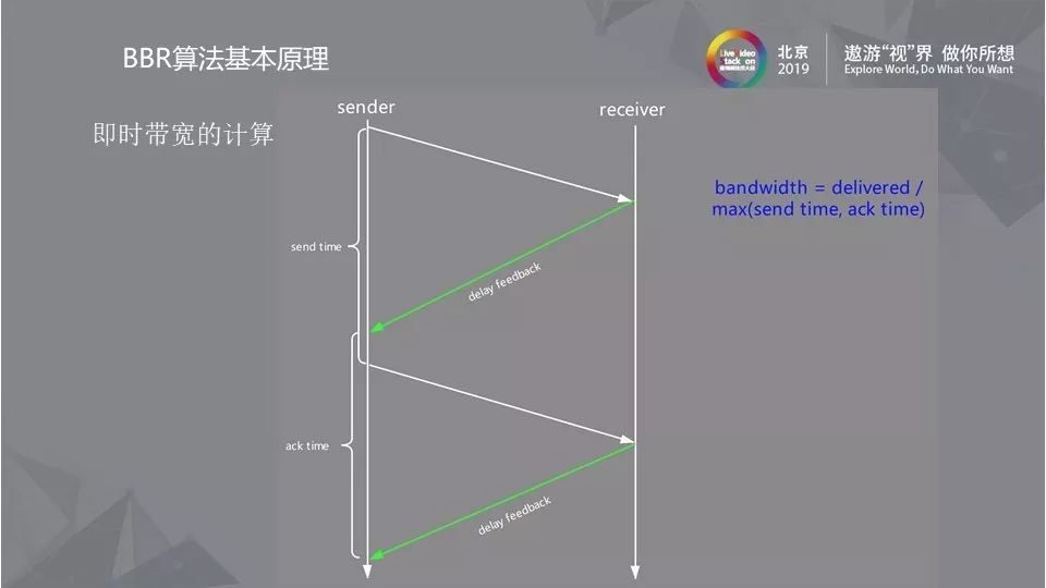 一般情况下的即时带宽计算,很多人认为将发送报文和收到报文的时间点记录下来,发包数量再除以时间就可以得到带宽,但这样的计算方式是错误的。由于delay feedback表示一组报文的响应,一组报文之后会有一个延迟的相应来通知哪些报文没有收到,以及收到的时间差是多少。delay feedback容易受到网络影响,因此报文不会均匀发送,易发生聚合和丢包现象,在计算时要考虑发送的时间差和ack的时间差,公式为:bandwidth = delivered/max(send time,ack time),这样才能抵消掉延迟聚合和丢失的情况。