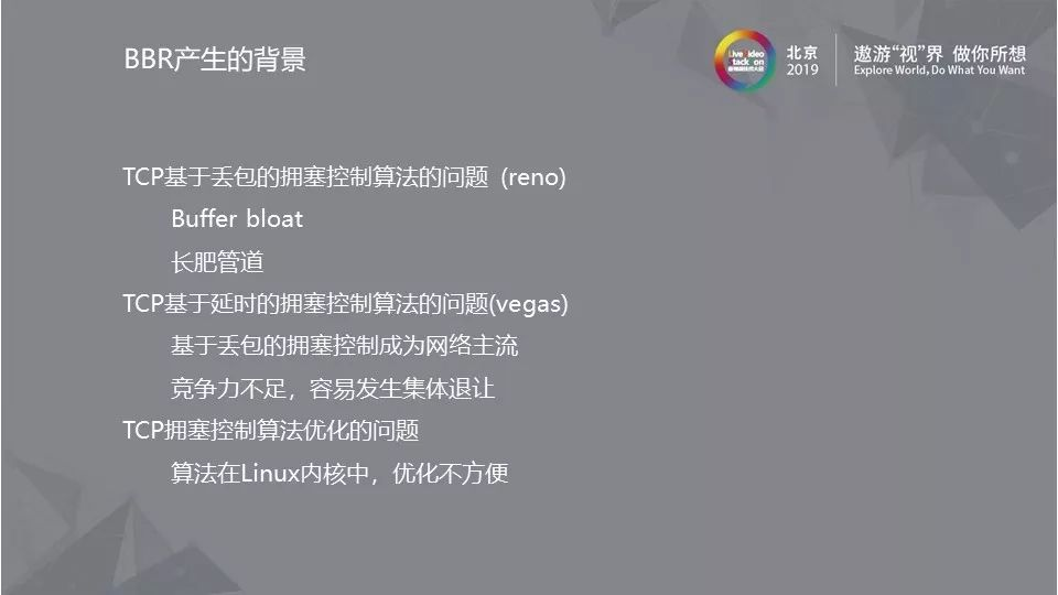 本次我分享的主题是BBR及其在实时音视频领域的应用,BBR全称是Bottleneck Bandwidth and RTT,它是谷歌在2016年推出的全新网络拥塞控制算法,在此之后大家对于拥塞控制的关注度逐渐提高,越来越多的新算法被推出。本次分享的内容主要包括BBR算法的基本原理以及BBR算法如何应用在网易云信的实时音视频产品中。