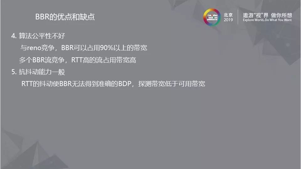 对于BBR在低延迟方面的优势来说,由于目前关于拥塞控制的算法很多,BBR在运转时设备中可能会有多种拥塞控制算法同时作用的情况,BBR算法只能保证自己不排队。但在实际现行网络下,是否排队并不由BBR一个算法决定,运行过程中BBR算法不会加重网络拥塞。