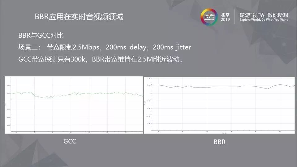如果将带宽限制在2.5Mbps,加入200ms delay,200ms jitter,此场景中GCC和BBR的表现如图所示,GCC带宽探测只有300k,而BBR带宽维持在2.5M附近波动,在如此恶劣的网络环境中BBR的表现已经是相当优秀了。