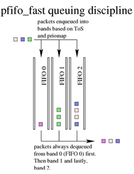 FIFO是linux网络接口的默认qdisc规则,没有整形和重排序的功能,仅对收到的包按照先入先出的顺序排出。pfifo_fast与pfifo类似,只是针对收到的流排出三个优先级。
