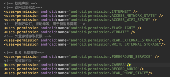 因为我们需要一些相应的权限,在Androidmanifest.xml中根据文档配置相应的权限