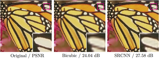 图1. 将原始图像缩小3倍后分别使用Bicubic (一种传统图像放大算法) 和超分辨率算法CNN (一种基于CNN的图像放大算法) 进行放大[1]。