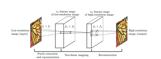 下图是一个简单的例子,来自经典的超分算法超分辨率算法CNN[1]。模型基于卷积神经网络,以原始图像为输入,先是用廉价的上采样算法将分辨率提升到期望的大小, 然后经过3层分别为9x9x128,3x3x64,5x5的卷积运算,得到超分输出。