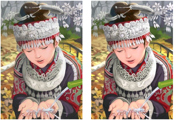 图4. 上图左侧为超分辨率算法GAN模型[2]放大4倍生成的图片,可以看到首饰的纹理被大幅修改。