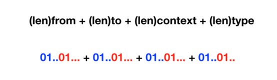 一条消息由from + to + context + type这几个属性组成,那么我们完全可以按顺序存储在二进制中,由于内容长度不确定,所以每个属性的开头我们可以使用固定字节数来记录这个属性的内容长度。当然,这里只是展示了一个二进制协议的例子,实际的消息会比这复杂多了,但是核心思路就是这么简单,最终无非是设计与实现形式上的差距。