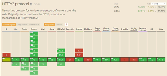可以看到国内有58.55%的浏览器已经完全支持HTTP/2,而全球的支持度更是高达85.66%。这么高的支持度,so,你心动了吗