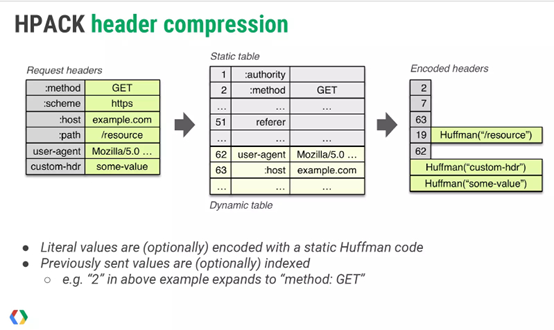 当要发送一个请求时,会先将其头部和静态表对照,对于完全匹配的键值对,可以直接使用一个数字表示,如上图中的2:method: GET,对于头部名称匹配的键值对,可以将名称使用一个数字传输,如上图中的19:path: /resource,同时告诉服务端将它添加到动态表中,以后的相同键值对就用一个数字表示了。这样,像cookie这些不经常变动的值,只用发送一次就好了。