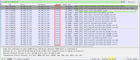 可以看到,抓到的都是TCP类型的包(红色方框);观察前三个包的内容(绿色方框),分别是SYN、[SYN, ACK]和ACK,这就我们所熟知的TCP三次握手;右下角的黄色小方框是请求当前页面后抓到的TCP包的总数,其实这个页面只有七八个请求,但抓到的包的数量却有334个,这也验证了HTTP/2的请求和响应的确是被分成了一帧一帧的。
