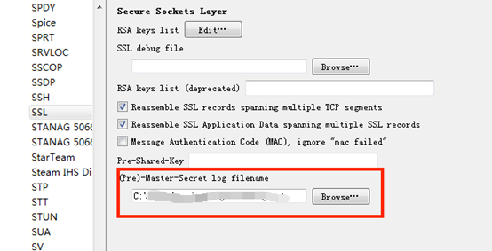 - 在wireshark中打开 preferences->Protocols,找到SSL,将配置面板的 「(Pre)-Master-Secret log filename」选中第一步创建的文件