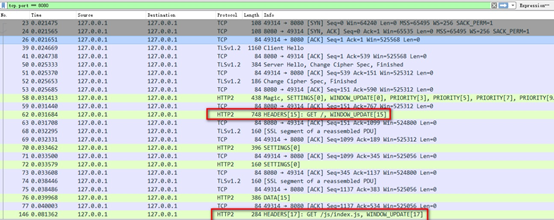 下图是在demo的主页面抓取的包,可以清楚地看到有哪些HTTP/2请求。