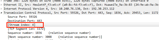 wireshark下方还有一个面板,里面有当前包的具体信息,如大小、源IP、目的IP、端口、数据、协议等,在Transmission Control Protocol下有一个[Stream index],如下图,它是TCP连接的编号,代表当前包是从哪个TCP连接中传输的。观察demo页面请求产生的包,可以发现它们的stream index 都相同,说明这些HTTP/2请求和响应是在一个TCP连接中被传输的,这么多流的确复用了一个TCP连接。