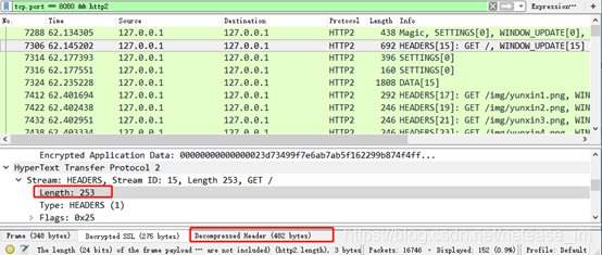 除了多路复用外,我们还可以通过抓包来观察HTTP/2的头部压缩。下图是当前路由下的第一个请求,实际被传输的头部数据有253bytes,解压后的头部信息有482bytes。压缩后的大小减少了几乎一半