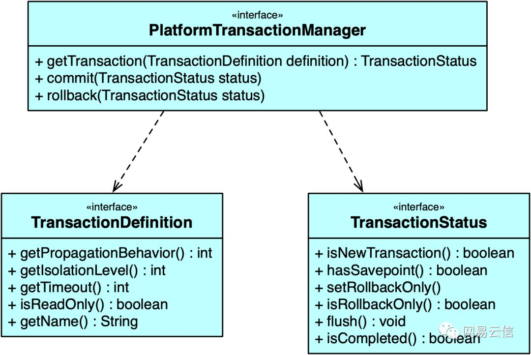 PlatformTransactionManager:事务管理器getTransaction方法:事务获取操作,根据事务属性定义,获取当前事务或者创建新事物;commit方法:事务提交操作,注意这里所说的提交并非直接提交事务,而是根据当前事务状态执行提交或者回滚操作;rollback方法:事务回滚操作,同样,也并非一定直接回滚事务,也有可能只是标记事务为只读,等待其他调用方执行回滚。TransactionDefinition:事务属性定义getPropagationBehavior方法:返回事务的传播属性,默认是PROPAGATION_REQUIRED;getIsolationLevel方法:返回事务隔离级别,事务隔离级别只有在创建新事务时才有效,也就是说只对应传播属性PROPAGATION_REQUIRED和PROPAGATION_REQUIRES_NEW;getTimeout方法:返回事务超时时间,以秒为单位,同样只有在创建新事务时才有效;isReadOnly方法:是否优化为只读事务,支持这项属性的事务管理器会将事务标记为只读,只读事务不允许有写操作,不支持只读属性的事务管理器需要忽略这项设置,这一点跟其他事务属性定义不同,针对其他不支持的属性设置,事务管理器应该抛出异常。getName方法:返回事务名称,声明式事务中默认值为“类的完全限定名.方法名”。TransactionStatus:当前事务状态isNewTransaction方法:当前方法是否创建了新事务(区别于使用现有事务以及没有事务);hasSavepoint方法:在嵌套事务场景中,判断当前事务是否包含保存点;setRollbackOnly和isRollbackOnly方法:只读属性设置(主要用于标记事务,等待回滚)和查询;flush方法:刷新底层会话中的修改到数据库,一般用于刷新如Hibernate/JPA的会话,是否生效由具体事务资源实现决定;isCompleted方法:判断当前事务是否已完成(已提交或者已回滚)。
