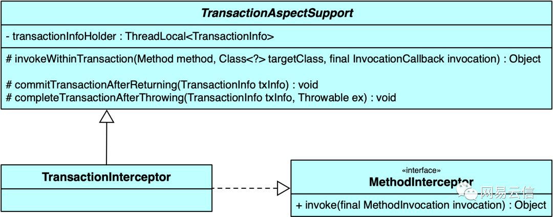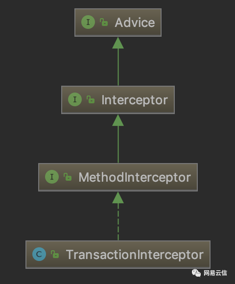 我们已经了解了AOP切面织入生成代理对象的过程,当Bean方法通过代理对象调用时,会触发对应的AOP增强拦截器,前面提到声明式事务是一种环绕增强,对应接口为 MethodInterceptor,事务增强对该接口的实现为 TransactionInterceptor,类图如下:
