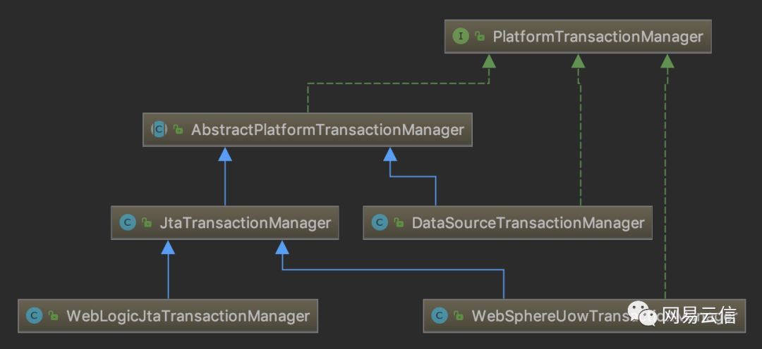 AbstractPlatformTransactionManager抽象类实现了Spring事务的标准流程,其子类 DataSourceTransactionManager是我们使用较多的JDBC单数据源事务管理器,而 JtaTransactionManager是JTA(Java Transaction API)规范的实现类,另外两个则分别是JavaEE容器WebLogic和WebSphere的JTA事务管理器的具体实现。