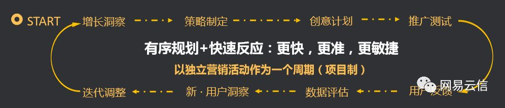 对于网易云信和网易七鱼来说,采取项目制的营销策略,以独立的营销活动作为一个周期,从增长洞察开始,依次以策略制定、创意计划、推广测试、用户反馈、数据评估为营销条线,并且在营销过程中对客户进行再次评估,形成新的客户洞察,以衡量之前的评估及洞察是否准确,从而进行迭代调整。整个营销活动做到有序规划和快速反应,形成了一个更快、更准、更敏捷的正向闭环。