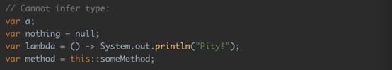 当编译器无法推断出正确的变量类型时,也不允许使用var。 以下所有代码示例都会导致编译器错误: