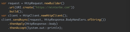 也可以使用异步来执行相同的请求。 调用sendAsync不会阻止当前线程,而是返回CompletableFuture来进行异步操作。
