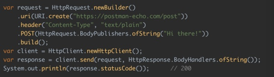 下一个示例通过POST将数据发送到给定的URL。 与BodyHandler类似,您使用BodyPublishers定义作为请求主体发送的数据类型,如字符串,字节数组,文件或输入流: