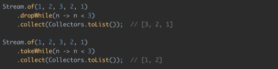 增加 takeWhile 和 dropWhile 方法,用于从stream中释放元素: