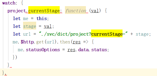 watch: {'project.currentStage': function (val) {let me = this;let stage = val;let url = "./svc/dict/project?currentStage=" + stage;me.$http.get(url).then(res => {me.statusOptions = res.data.status;})}},