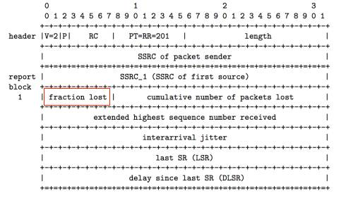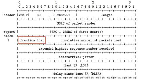 WebRTC通过RTCP协议的Receive Report反馈包来获取接收端的丢包率。Receive Report包中有一个lost fraction字段,包含了接收端的丢包率,如下图所示。