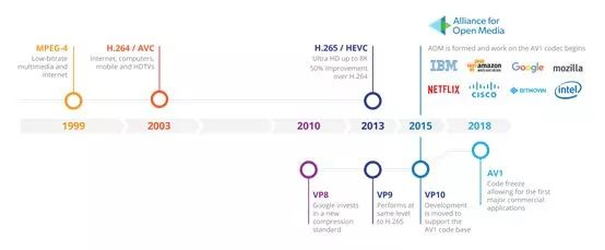 AOM(AOMedia)是一个非盈利的中立跨行业的开源联盟(非盈利的中立组织这个属性非常重要,下文有详解),这个联盟由半导体企业、视频点播供应商和网页浏览器开发商于2015年成立。AV1的目标是取代其前身VP9并与动态图像专家组(MPEG)的高效率视频编码(HEVC)以及第二代数字音视频编解码技术标准(AVS2)竞争。是作为H.265又名HEVC的竞争对手。