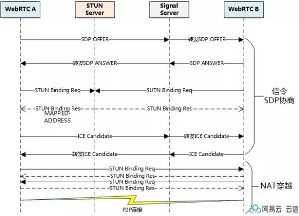 5)NAT穿越成功,A、B之间的P2P连接建立,进入媒体互通阶段。在这个过程中,我们看到了有三个核心的部分,SDP协商、ICE Candidate交换、Stun Binding Req/Res的连通性检查。