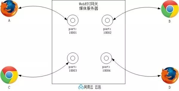 最简的服务器端端口方案是我们可以为每个客户端分配一个端口,服务器上使用这个端口区分每个用户,就像图里描述的A、B、C、D四个人在WebRTC网关服务器上分别对应UDP端口10001~1004。这种方案逻辑上很简单,很多开源的服务器都采用这个方案,如janus。另外一个原因是使用了libnice库在服务器上来和客户端做ice建连,类似的做法都是采用多端口的架构。